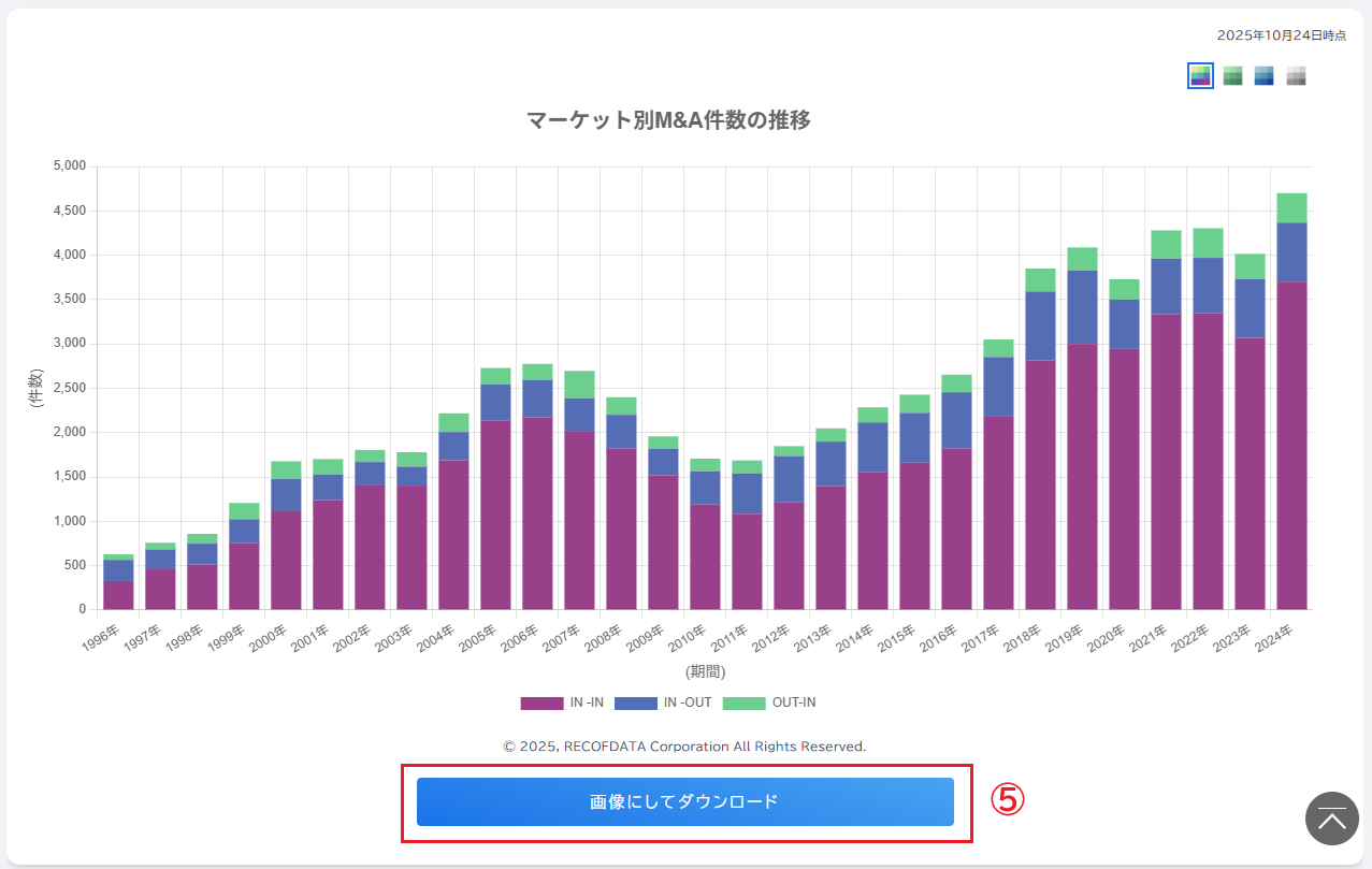 - [表示]をクリックすると、[グラフの種類]と[期間]で選択したM&A動向の集計結果のグラフが生成されます。