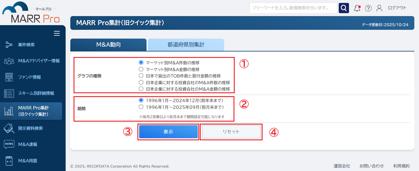 初期状態ではM&A動向を集計するための、検索項目だけが表示された状態です。